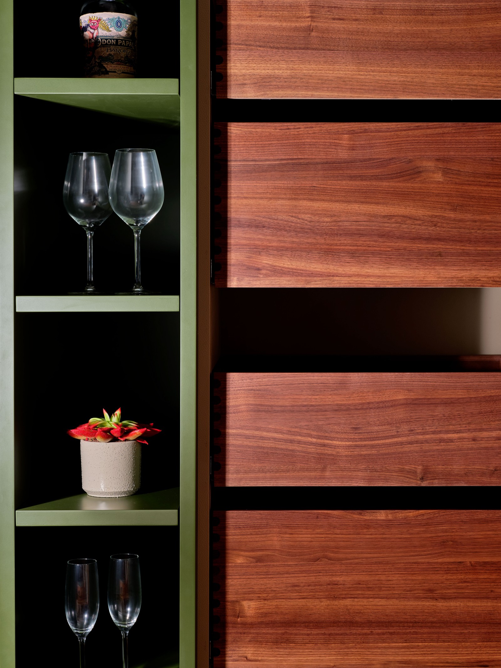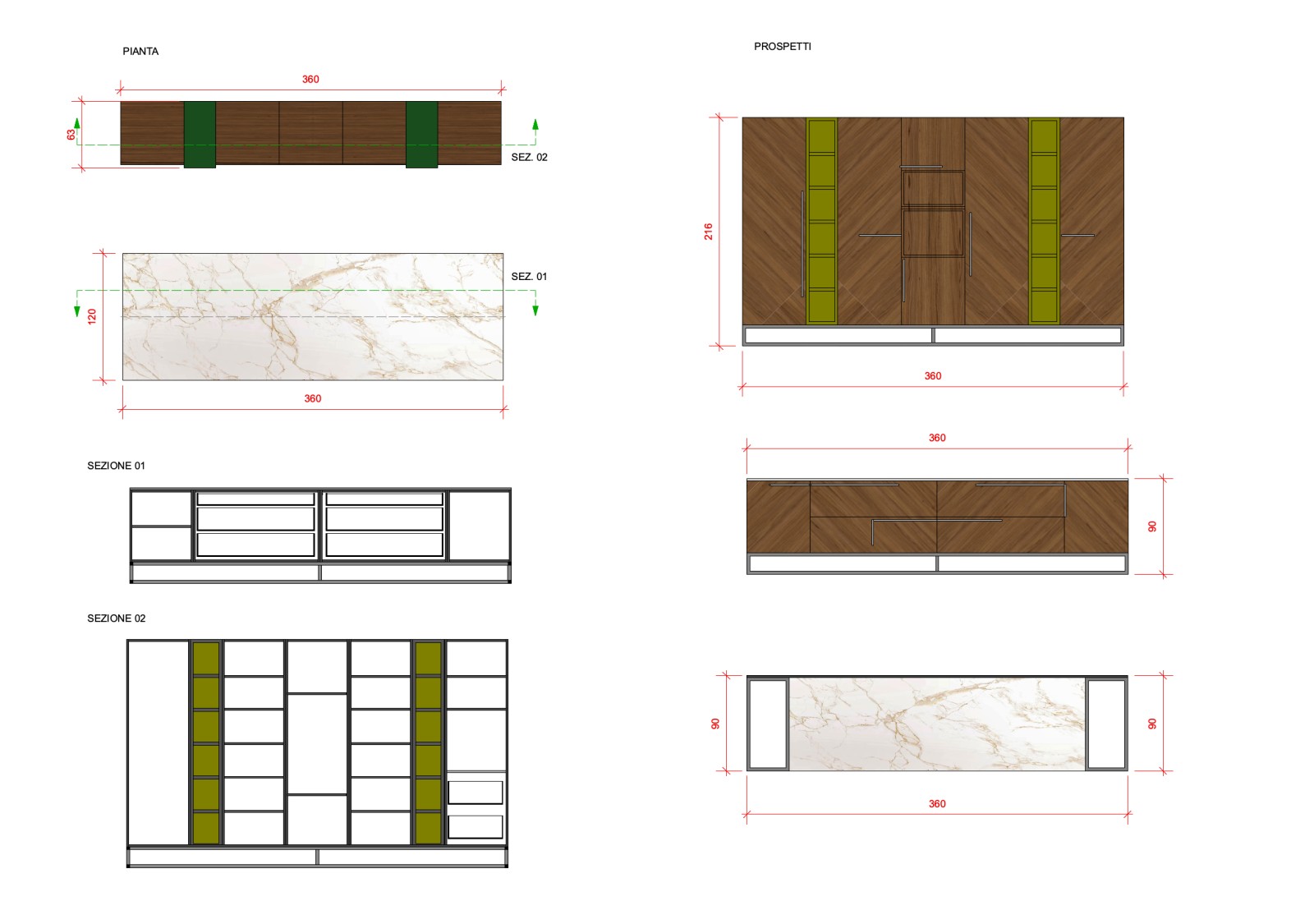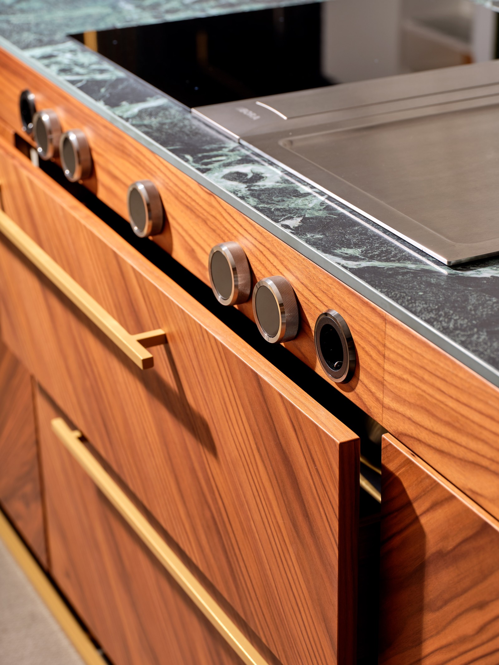 L'uso del noce canaletto, con la sua venatura unica e il colore caldo, arricchisce l'insieme conferendo eleganza e raffinatezza, creando un'atmosfera accogliente ma allo stesso tempo sofisticata. L'isola centrale, che funge sia da superficie di lavoro che da zona conviviale, è impreziosita da dettagli in metallo dorato, che aggiungono luminosità e un accento di lusso all'ambiente.