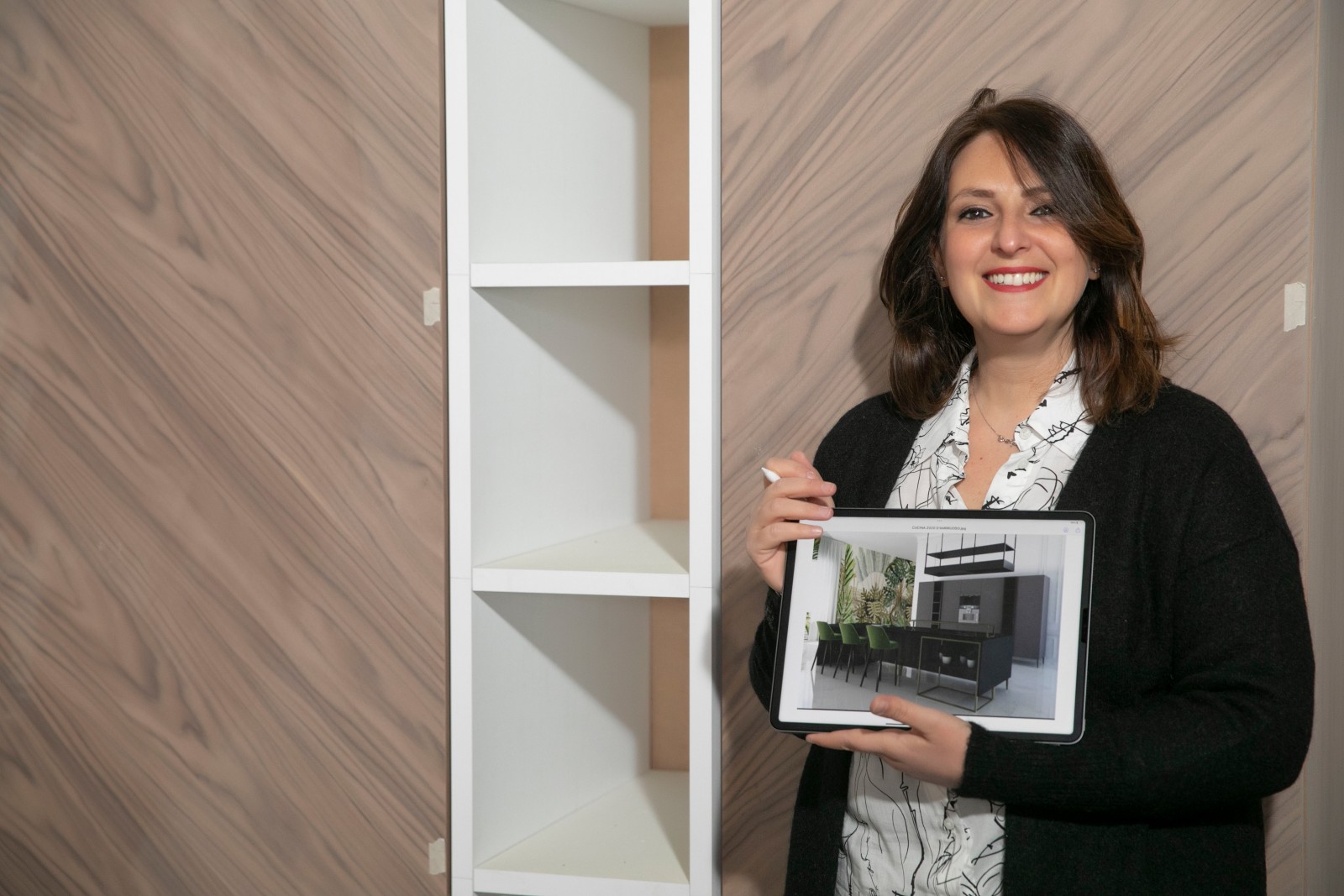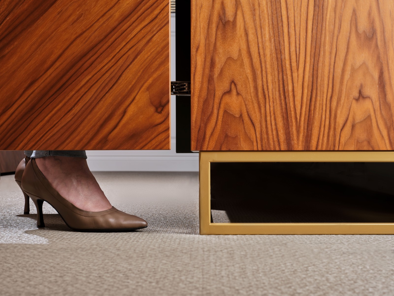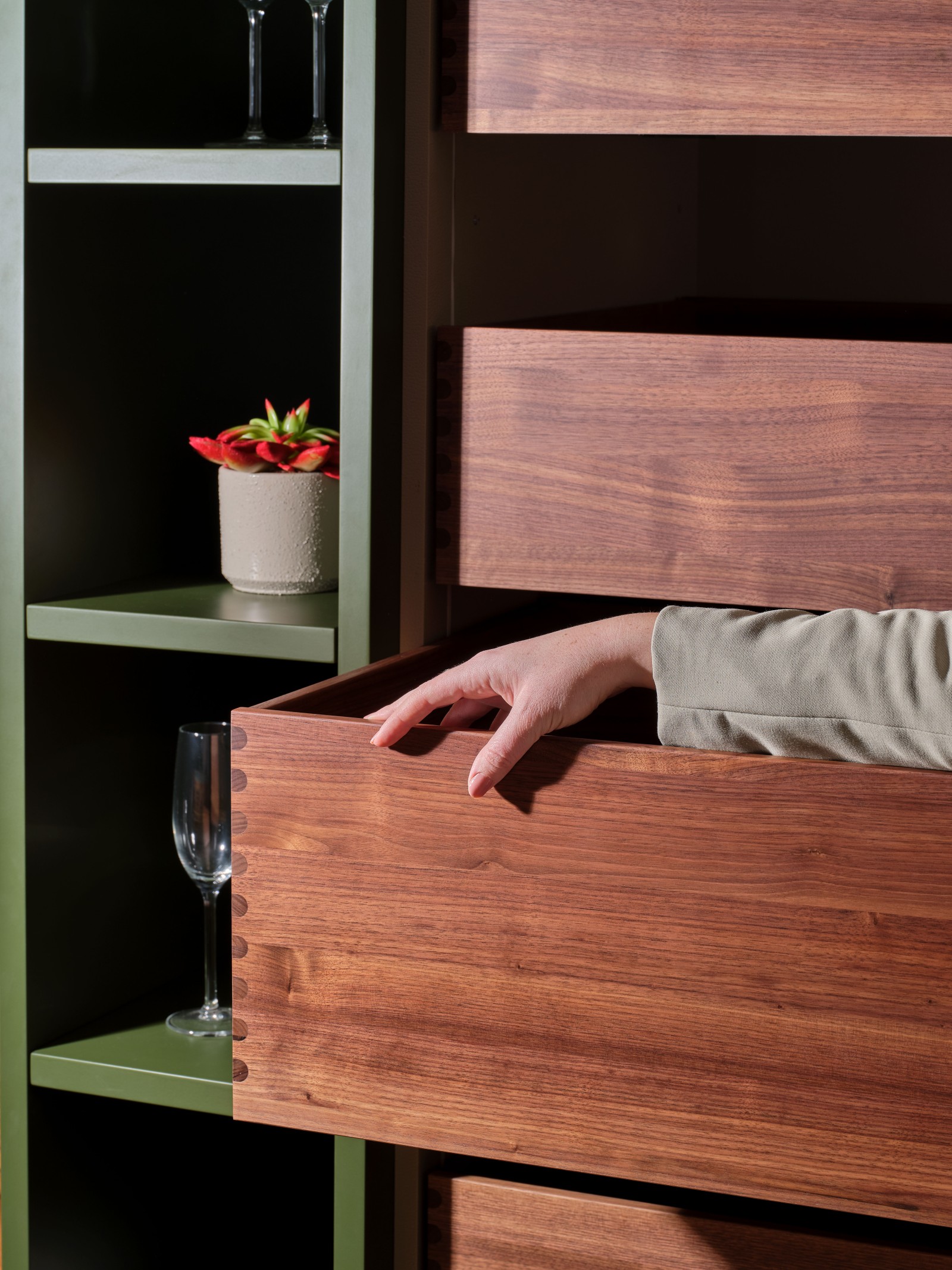 L'uso del noce canaletto, con la sua venatura unica e il colore caldo, arricchisce l'insieme conferendo eleganza e raffinatezza, creando un'atmosfera accogliente ma allo stesso tempo sofisticata. L'isola centrale, che funge sia da superficie di lavoro che da zona conviviale, è impreziosita da dettagli in metallo dorato, che aggiungono luminosità e un accento di lusso all'ambiente.