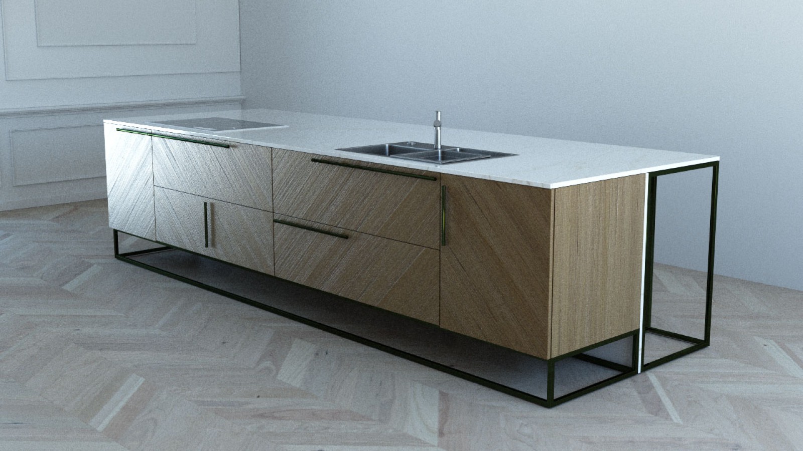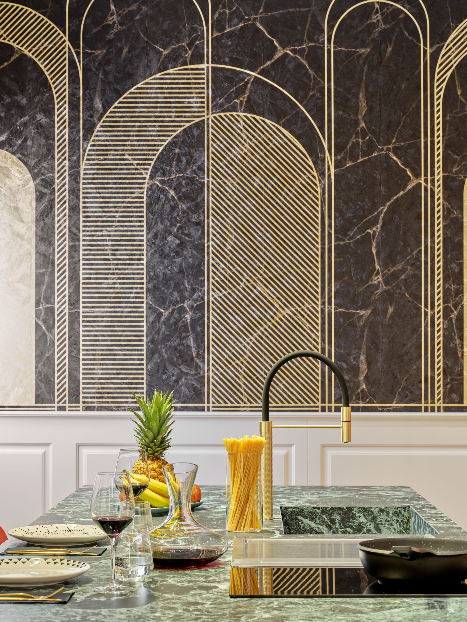 L'immagine ritrae una cucina di design esclusivo, caratterizzata da una distribuzione ad isola che conferisce un tocco di modernità e funzionalità all'ambiente