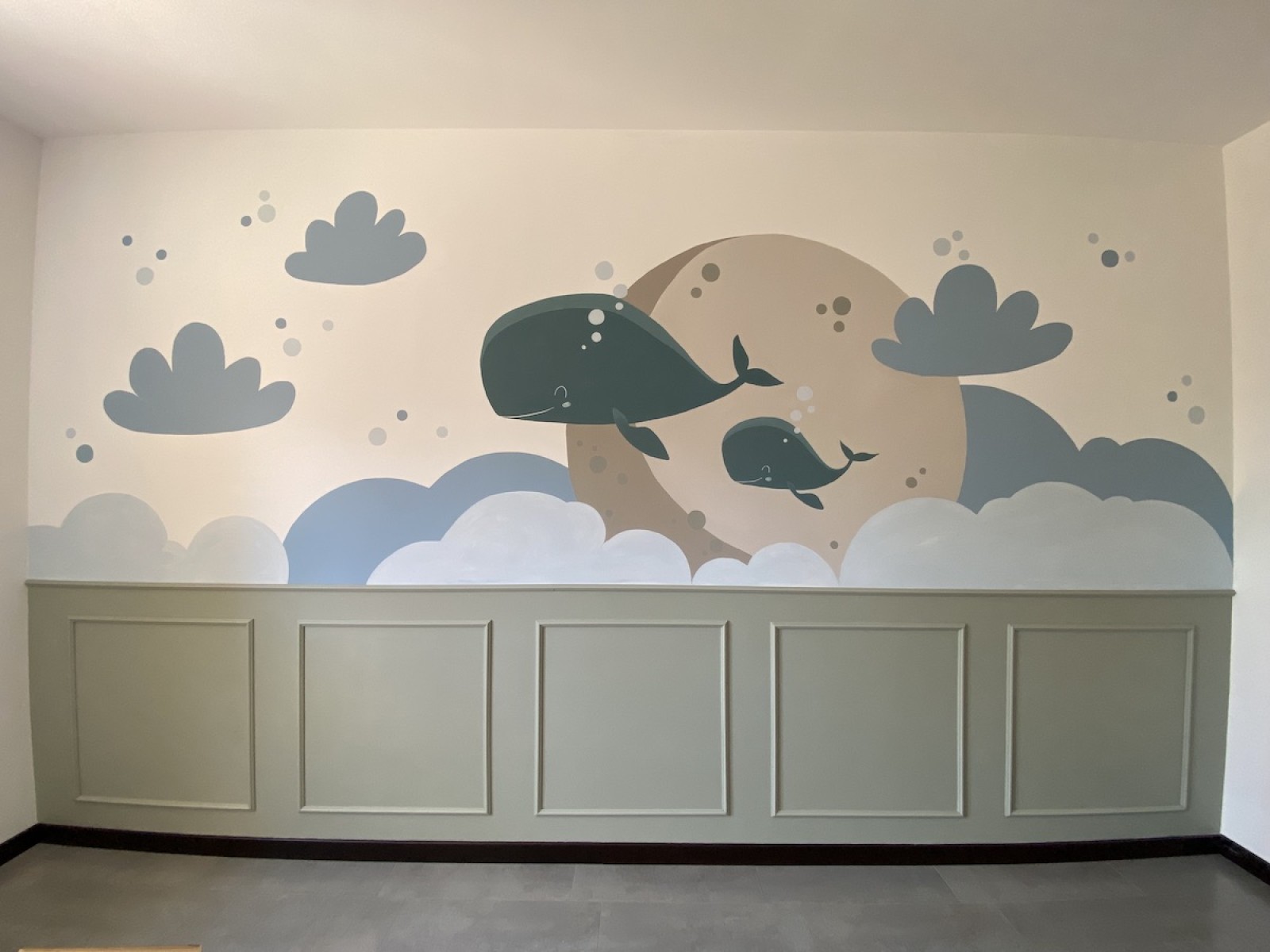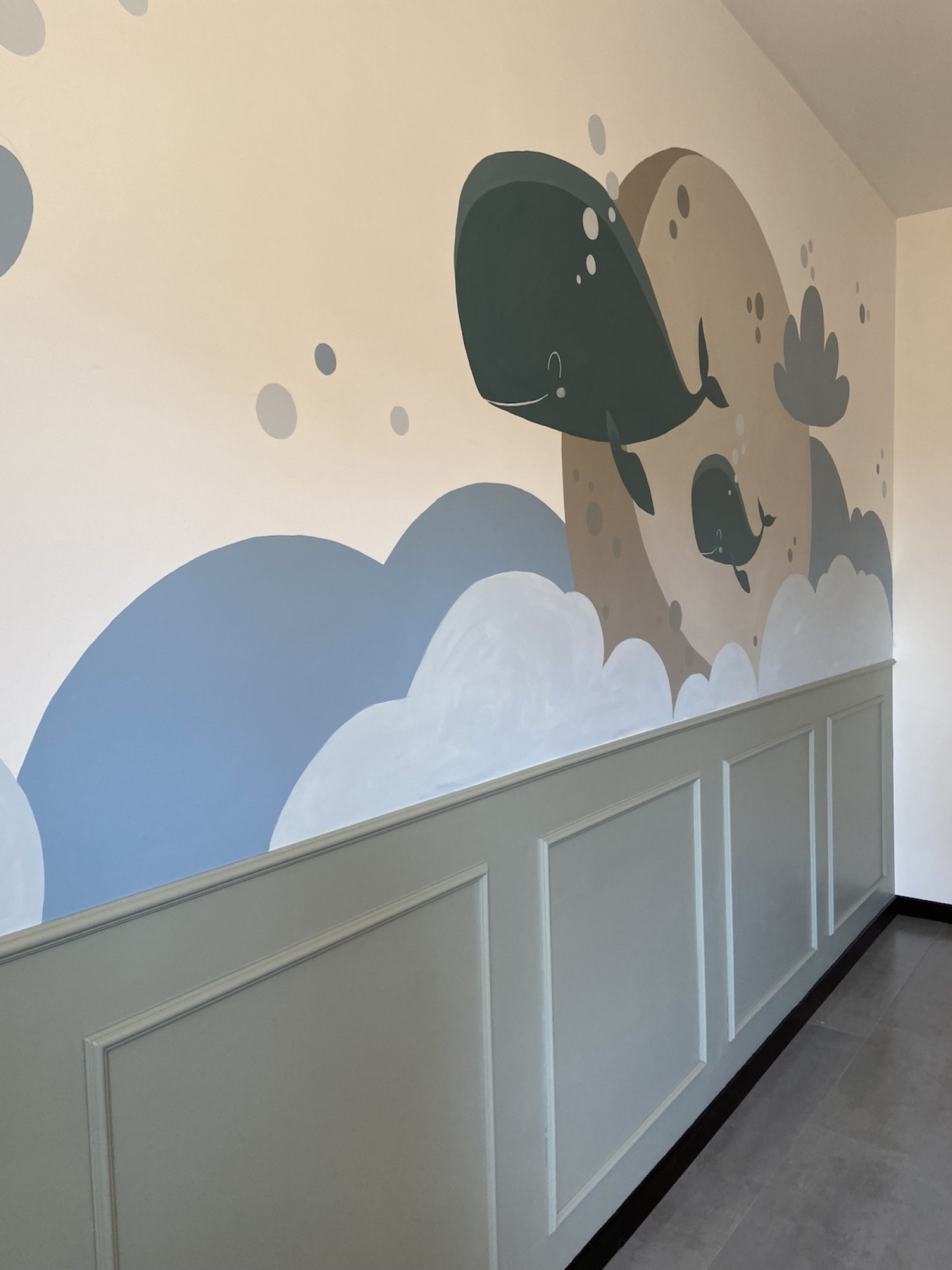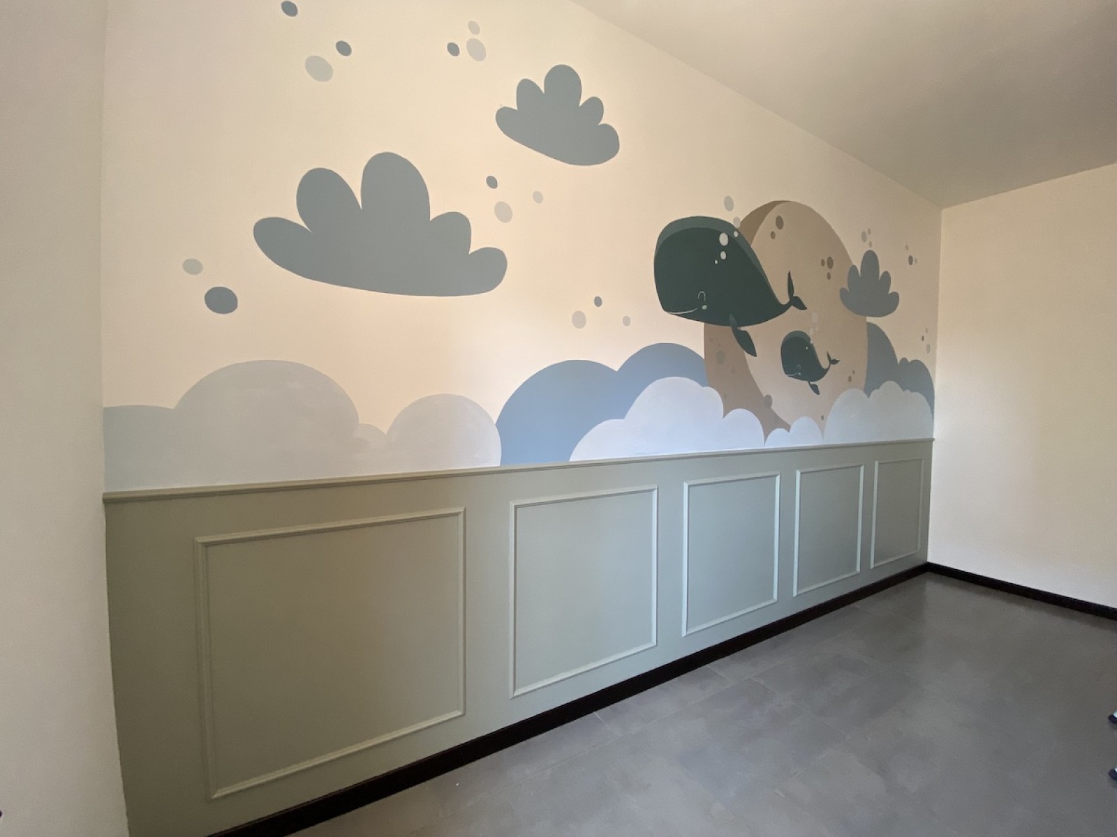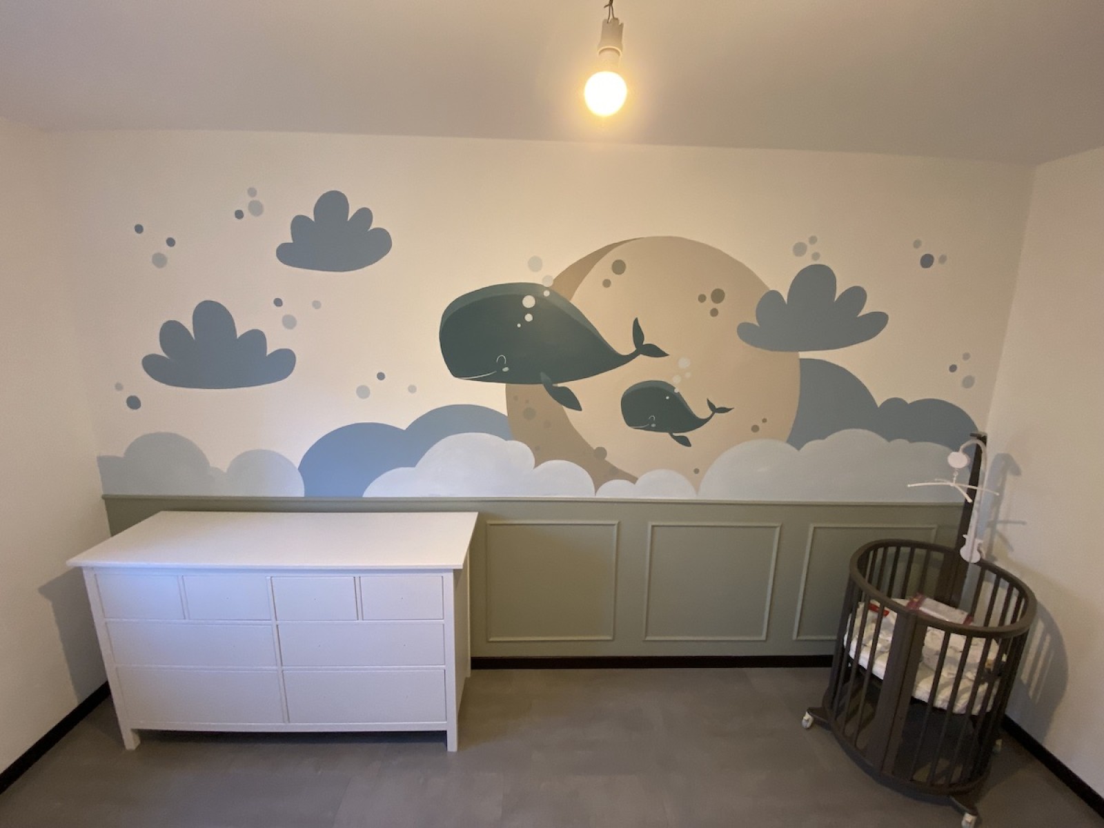 Il neonato ha bisogno di colori tenui, pastello, che trasmettono tranquillità, come quelli che ho realizzato a mano per questa cameretta, con decorazioni semplici, stilizzati, con forme morbide, tutto ciò trasmetterà tranquillità al piccolo e non solo, più andrà avanti con i mesi e più sarà stimolante perché riconoscerà le forme.